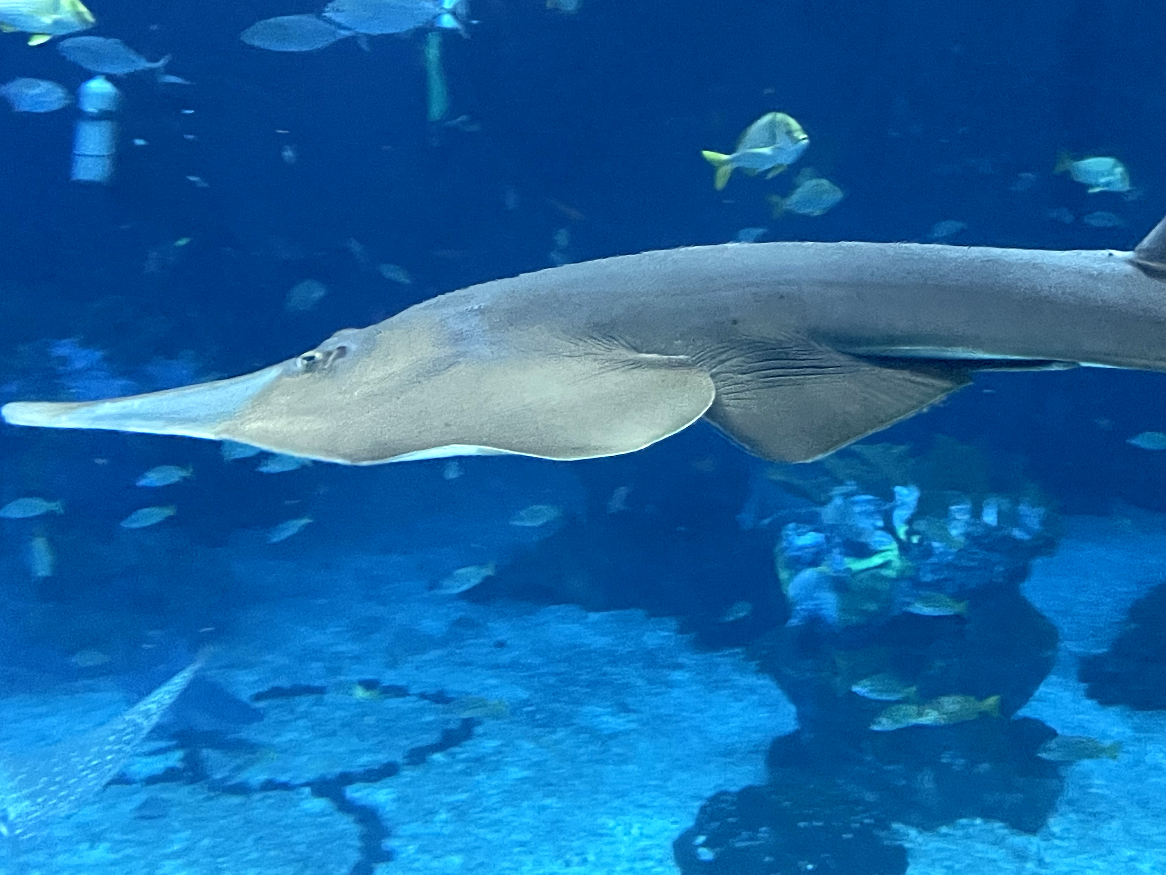 Orlando Vacation 2023 - Epcot aquarium Guitar Fish - half-shark, half-stingray (their mouth is on their bottom-side, like stingrays