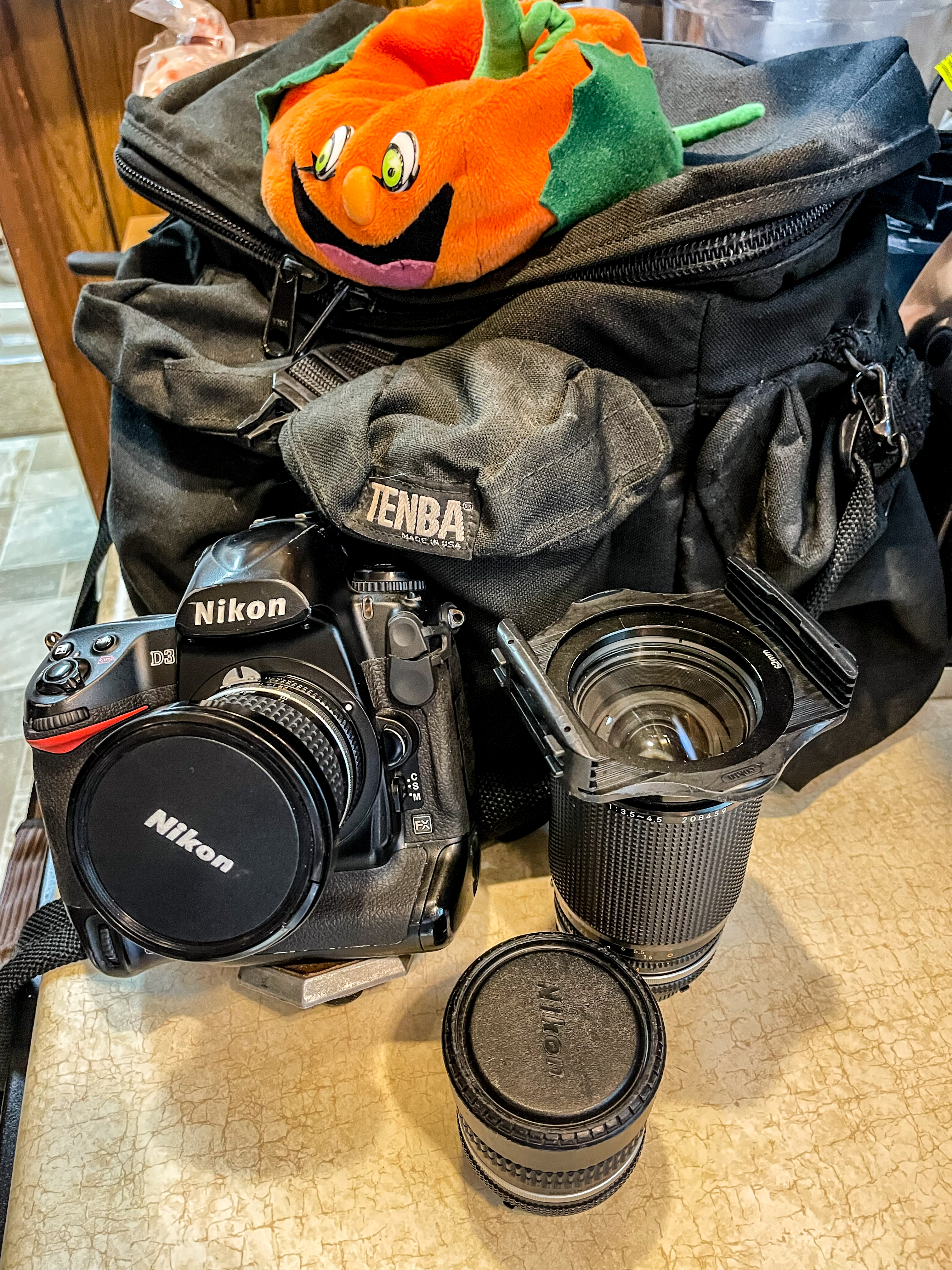 My (camera) kit for Ireland: a well-worn Nikon D3, Nikkor manual focus 18mm f3.5 AI-S (mounted), 16mm f2.8 AI-S fish-eye and