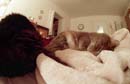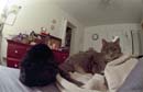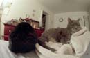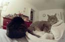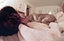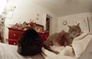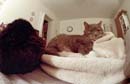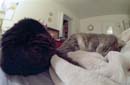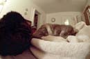 Here are two cats working hard at the prime directive: pace yourselves! The feline backside to the left is Tiggr; Puff is the one occasionally squinting at the camera. Taken with a Nikon F3 using a 16mm fisheye lens about 14" away from Puff's nose. No flash - just Puff's brilliant personality for illumination.
