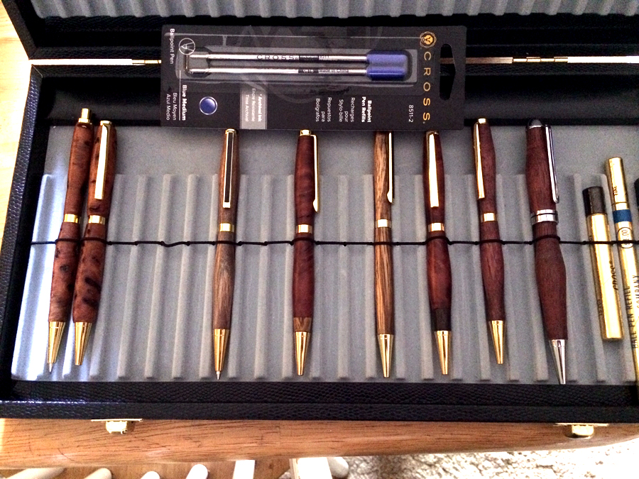 Pens of red river gum, zebrawood, bloodwood and walnut.