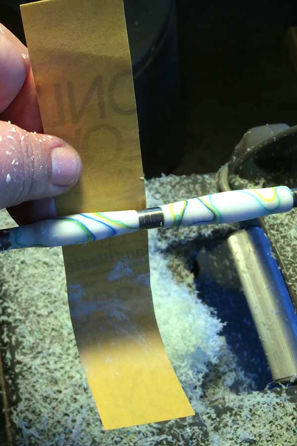 Turning acrylic. This is in the sanding stage. While it's quite easy to turn, it stinks enough that one wears a respirator while turning it.