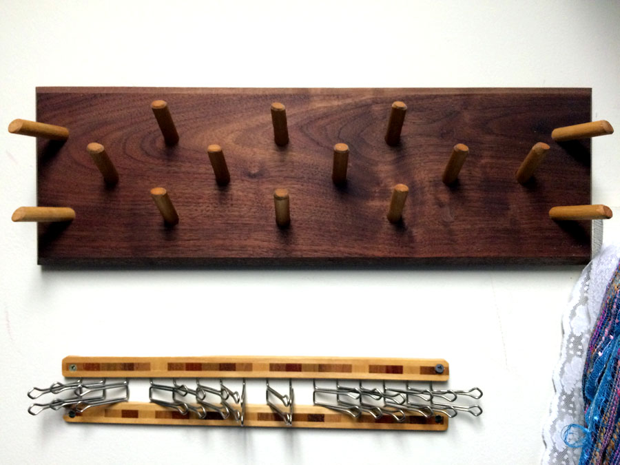 Bowtie rack installed. Notice the absence of screws! Used a French cleat to fasten it to the wall.