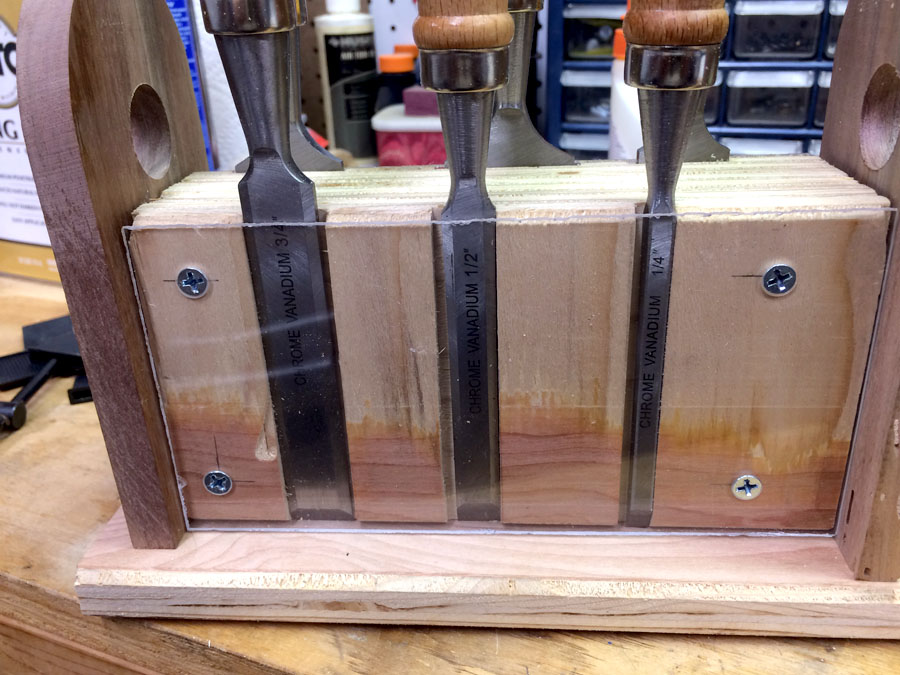 A view from the side. The holes are the handles. And a cool plexiglass window to let you view your chisel before selection.