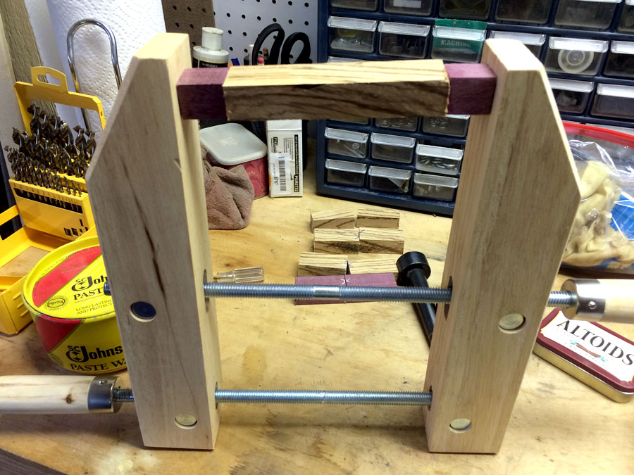 The start of my next turning project - gluing two end pieces of bloodwood to a piece of zebrawood.