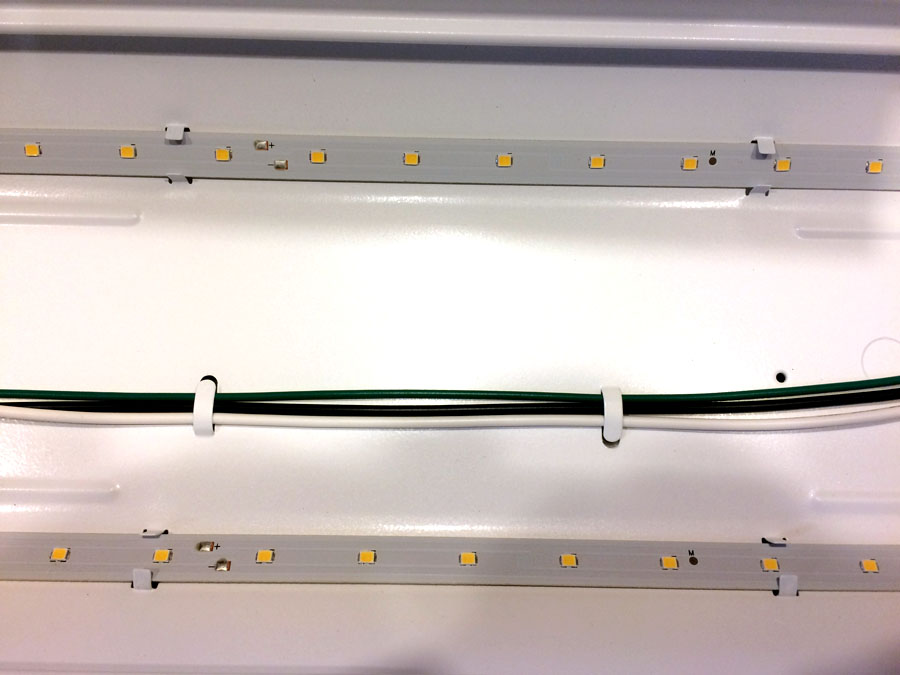 Welcome to the 21st century! The little orange squares are LEDs. And, while this fixture looks a lot like a standard fluorescent, the "bulbs are missing!" But these little guys, while initially more expensive, are much brighter, much cooler, much more efficient (and therefore, cheaper to run), and will last longer than any bulb unit.
