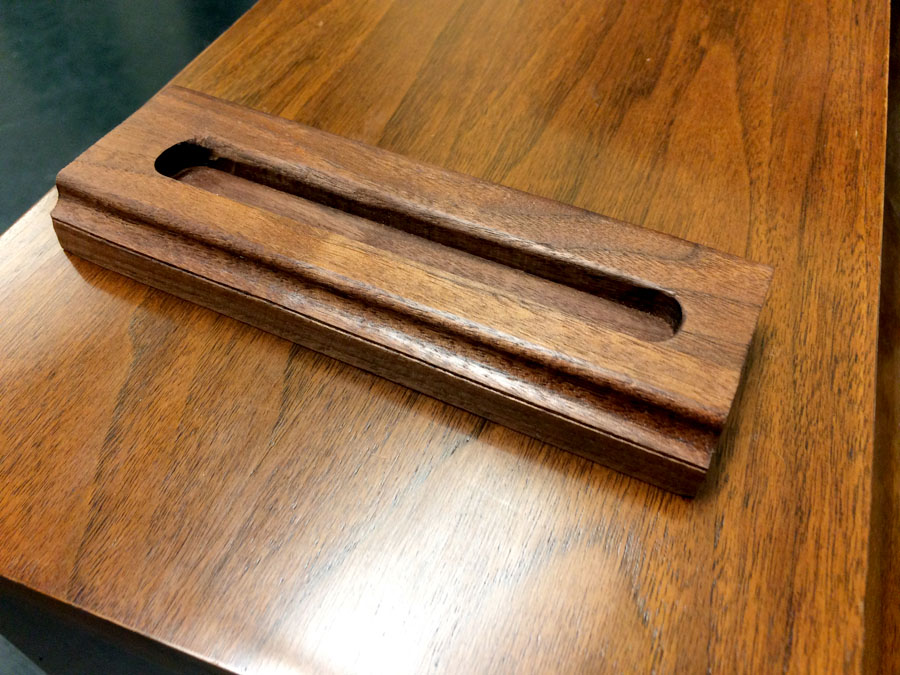 An iPhone holder for my ballet classes. No, I don't dance (silly people!), I provide music to which the ballet classes dance. Several years ago, they repainted the dance studios at the university and never re-installed the clocks on the walls. So the dance professors (since they can't wear their watches and demonstrate/dance at the same time) scurry over to their bag/purse to check their phone for the time. Since then, I made these iPhone holders to prop my phone up so they could see my "bigger clock" app (which you can actually see from across the room). I made one of these for my iPhone 5, then another larger one when I upgraded to an iPhone 7.