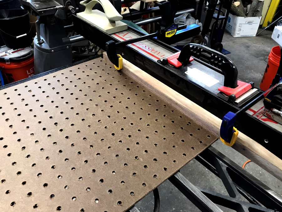 In order to cut the pegboard on the table saw, I had to use a jig to keep the thin sheet from slipping under the fence.