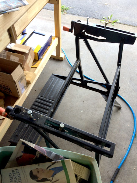 The skeleton of a Black & Decker ShopMate. Really handy to have one of these around the shop. Unfortunately, the business end of it is made from a composite material, maybe fiberboard? Anyway, both boards succumbed to H2O poisoning, swollen, warped and unusable. Actually, they were useful for one thing - to get approximate measurements off of them for their replacements.