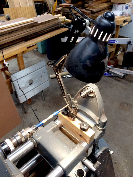 Work light in action - it's quite handy when turning. It also has three holes for positioning the lamp.