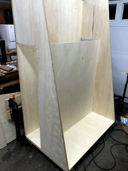 Wood stock rack. The opening in the back is for long boards and sheet goods. It still has a shelf unit to be installed. The whole unit is mounted on heavy-duty casters, and will (some day) include a bracket assembly for cutting panels with a circular saw.