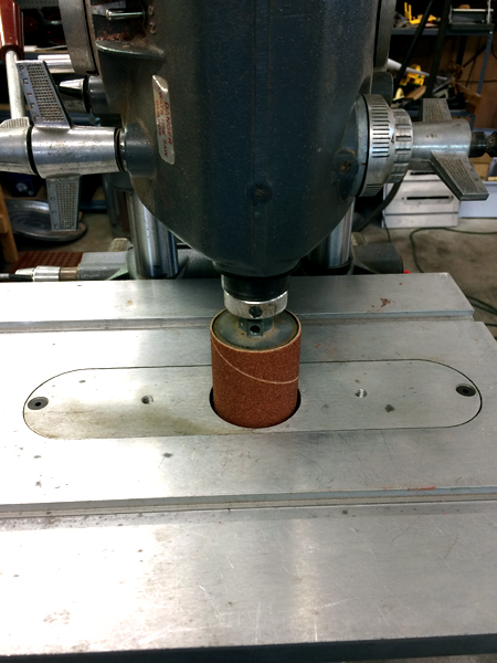 Set up as a drum sander. Quite usefull for sanding curves. Has a whole set of diameter drums for smaller work.